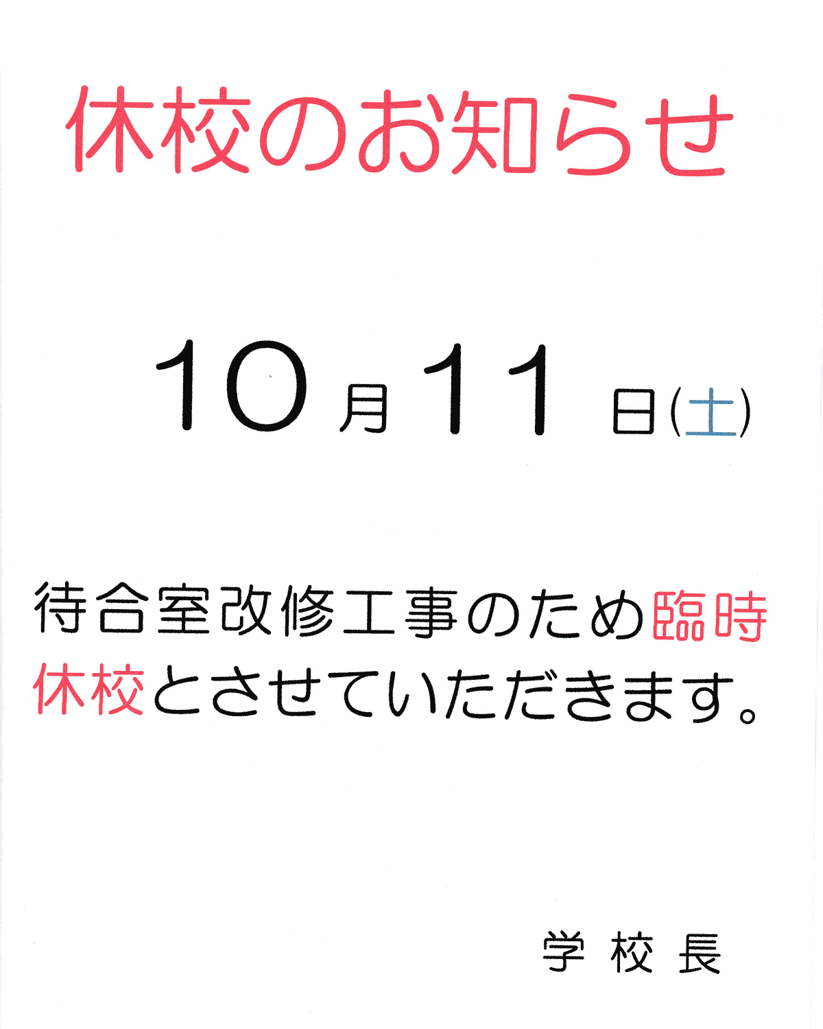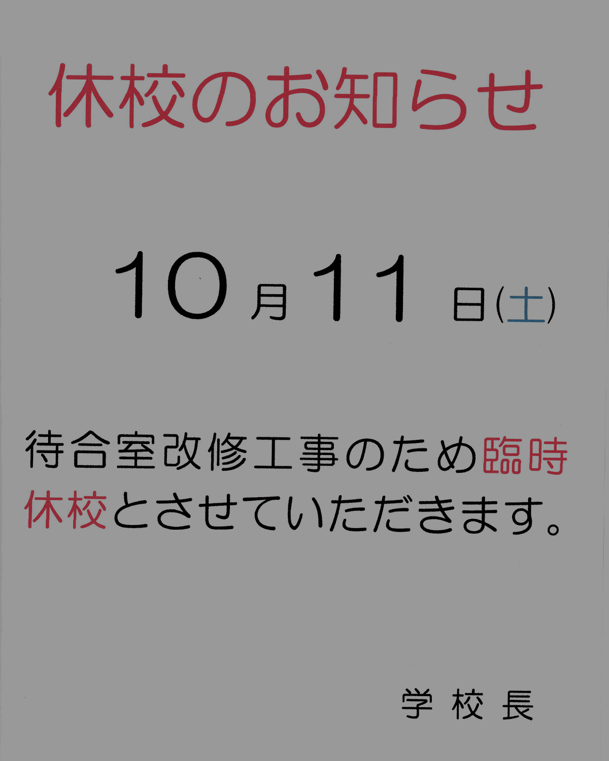 10月11日(土曜日)は当校控室改修工事の為、臨時休校とさせていただきます。
