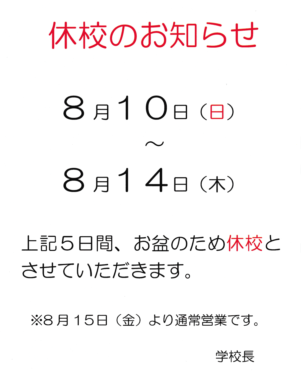 8月10日(日)より8月14日(木)まで休校とさせて頂きます。